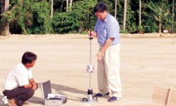 Груз известного веса падает с фиксированной высоты, воздействуя при этом с определенной силой удара на нагрузочную плиту. Нагрузочная плита под действием силы удара вызывает осадку грунтового основания. Ускорение, скорость и величина осадки подвергаются электронной обработке и рассчитывается динамический модуль упругости (Evd)