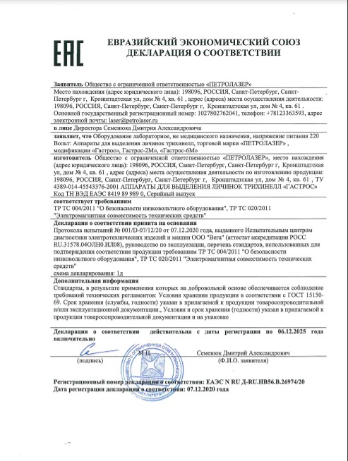 Аппарат для выделения личинок трихинелл «Гастрос 2 М» — предназначен для выделения личинок трихинелл методом группового переваривания в искусственном желудочном соке. Аппарат реализует методику исследования на трихинеллез, утвержденную Департаментом Ветеринарии.