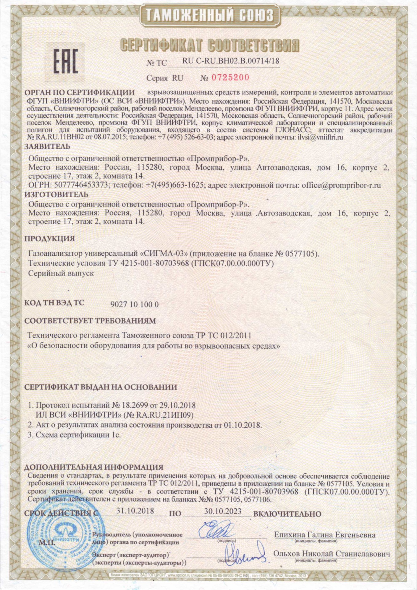 Сертификат соответствия № ТС RU C-RU.BH02.B.00714/18 срок действия до 30.10.2023