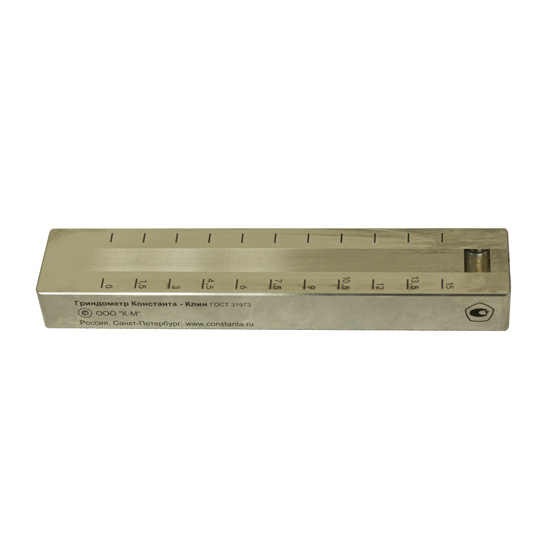 Прибор состоит из стальной измерительной плиты и скребка. На измерительной поверхности плиты вдоль нее выполнен клинообразный паз с равномерно увеличивающейся глубиной от «0» до максимального предела измерения прибора. По краям паза нанесена цифровая шкала. Глубина паза соответствует шкале прибора.