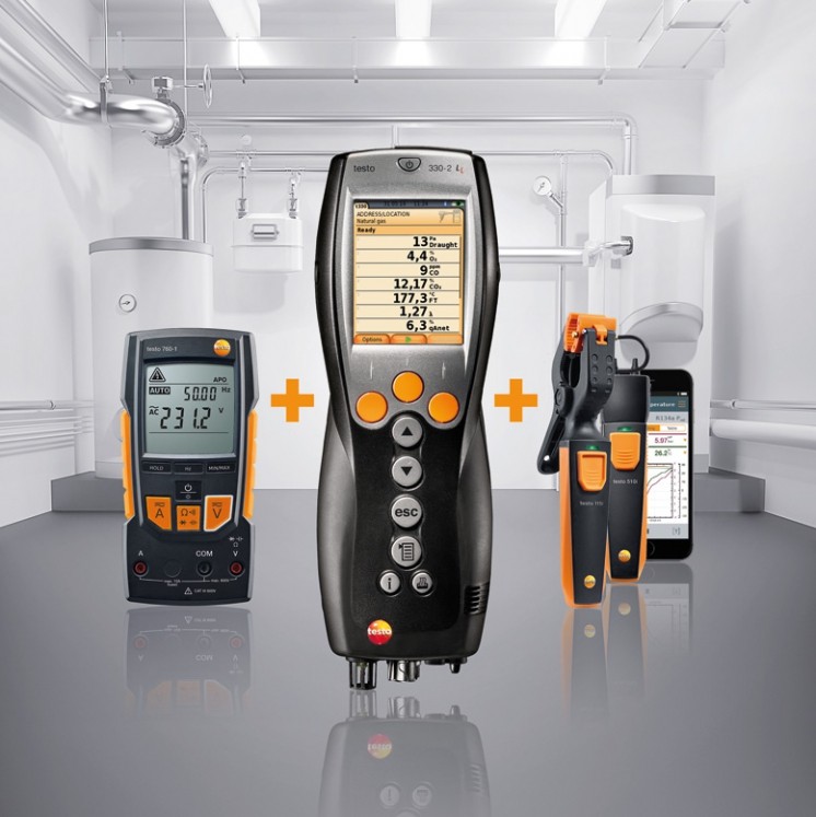 Новый комплект Testo 330-2 LL NOx + Мультиметр Testo 760-2 с магнитным креплением предназначен для пуско-наладки и периодического технического обслуживания конденсационных котлов, дизельных и газовых вентиляторных горелок, пеллетных и твердотопливных котлов, создания режимной карты котла.