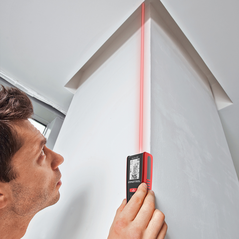 Площадь стен (функция маляра) — Рассчитать расход материалов для ремонта (обои, шпаклевка) с дальномером CONDTROL Vector 80 не составит труда. С функцией маляра вы быстро определите площадь стен помещения, достаточно один раз измерить высоту потолков и длину всех стен. Дальномер сам складывает полученные площади и показывает их нарастающим итогом.