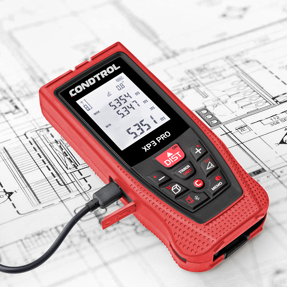 Функция маляра (вычисление площади стен) — В дальномере CONDTROL XP4 это решено нетривиально, достаточно измерить длину, ширину и высоту помещения, на экране прибора появится 3D модель комнаты со всеми параметрами, включая площадь стен, площадь пола, периметр и объем помещения. Таким образом любой маляр сможет рассчитать расход краски, обоев и протяженность плинтуса.