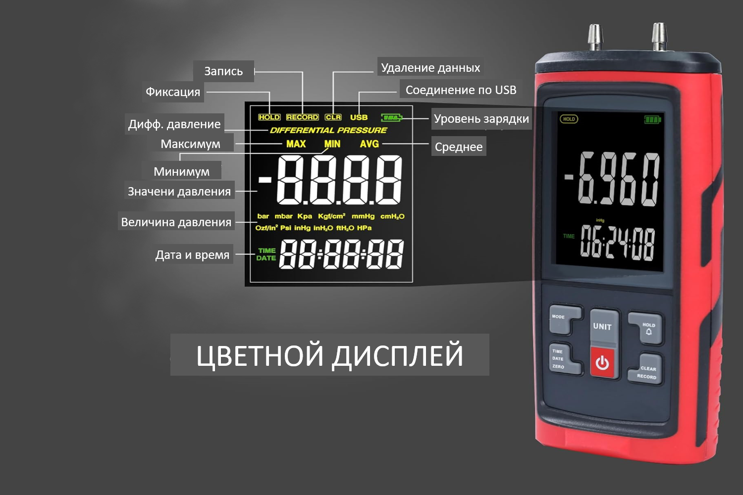 • Выбор единицы измерения давления из 13 международных величин.