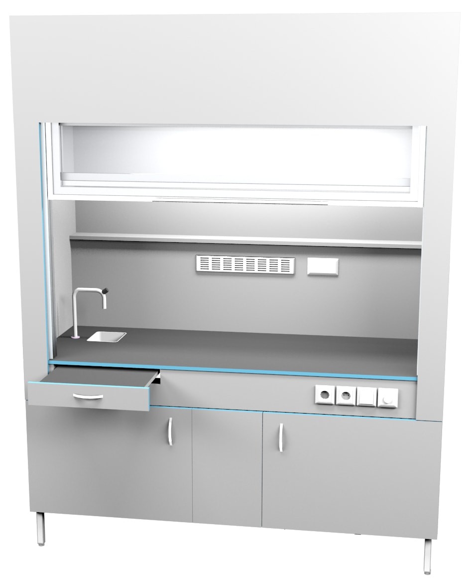 Шкаф вытяжной с сантехникой ШВ НВК 1800 ПЛАСТ+ (1800×716×2200). Описание: Вытяжные лабораторные шкафы применяются при работе с токсичными и вредными летучими материалами, с чистыми материалами, с растворением или разложением под температурной обработкой, при проведении анализа проб и многих других. Особенности: Полипропиленовая раковина, обладающая высокой химической стойкостью Химически стойкий кран из латуни с полипропиленовым напылением для подключения холодной воды Дополнительная подсветка сбоку с плавной регулировкой Выдвижной столик Вытяжка из нижней тумбы позволяет хранить в ней реактивы Ударопрочный подъемный кран легко поднимается одной рукой Экран в поднятом состоянии не увеличивает высоту шкафа Внутри рабочей камеры полочка для хранения реактивов Две влагозащищенных розетки с крышкой внутри рабочей камеры Специальные доводчики в тумбе позволяют закрывать тумбу бесшумно По заказу столешницы могут быть выполнены из: химстойкого пластика керамогранита (плитка) полипропилена нержавеющей стали монолитной керамики эпоксидного керамзита