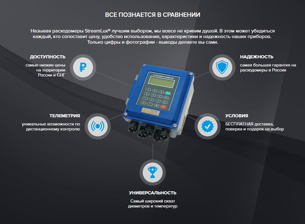Выполненные на базе самых эффективных методов измерения интенсивности потоков жидкостей, стационарные ультразвуковые расходомеры StreamLux® дают своим владельцам возможность ощутить все преимущества современных технологий.