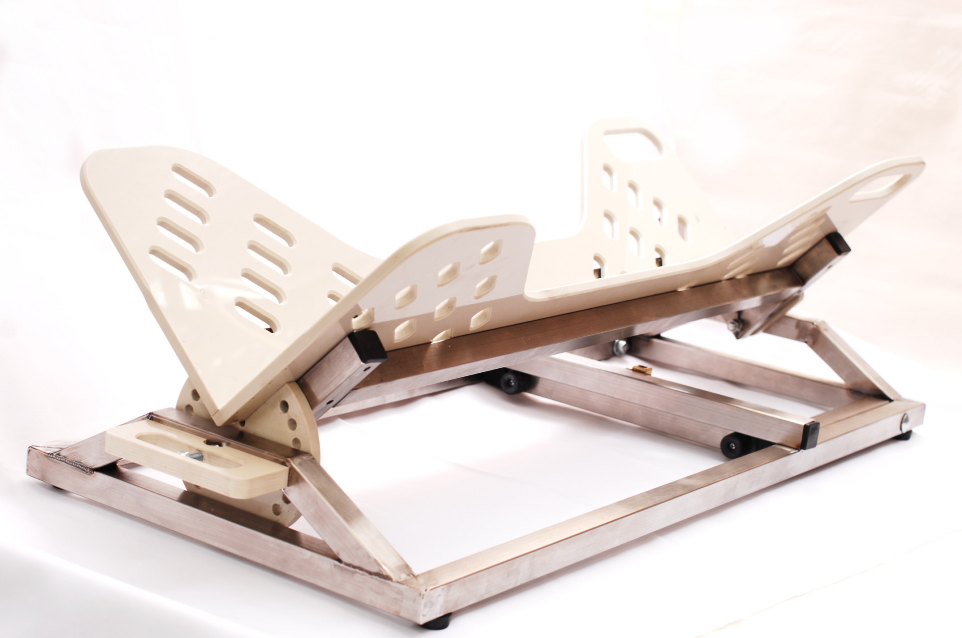 Регулировка положения пациента вдоль продольной оси тела позволяет получить доступ к органам брюшной полости, перемещая их для удобного доступа при диагностике и проведении оперативного вмешательства. Для удлинения ложемента, с целью разместить на СВЛ-2 более крупное животное, в комплектацию может входить удлинитель. При проведении артроскопических манипуляций с использованием артроскопа — к изделию комплектуется дистрактор конечностей. К этому станку ( накладке на стол) мы также выпускаем электропривод, для перекладывания фиксированного животного с боку на бок без усилий и фиксации в любом промежуточном положении. Управление приводом — от педали (см. Фото 6, 7). Поверхности СВЛ-2 выполнены из химически стойкого полипропилена толщиной 10 мм и позволяют любые способы дезинфекции. Для фиксации животного в ложементе предусмотрено множество удобно расположенных отверстий.