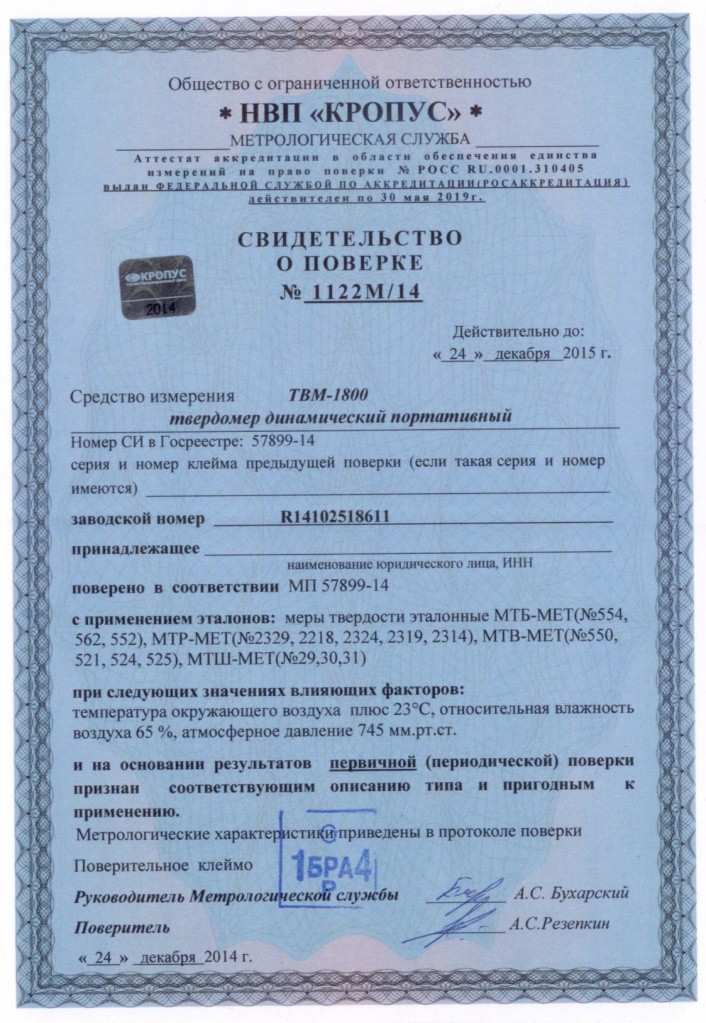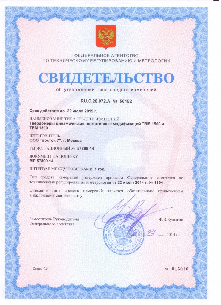 Твердомеры портативные динамические модификаций ТВМ 1500 и ТВМ 1800 являются средствами измерений, зарегистрированными в Государственном реестре СИ России под № 57899-14, межповерочный интервал 1 (один) год.