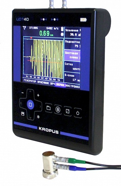 Ультразвуковой толщиномер УДТ-40 — это универсальный прецизионный толщиномер с высокой точностью и достоверностью контроля. Наличие А-скана исключает такие типичные ошибки при измерении толщины, как удвоение показаний, а В-скан позволяет наблюдать профиль дна изделия. Толщиномер реализует различные высокоточные способы контроля толщины – измерение времени по переходу через «ноль», измерение времени между сигналами, измерение толщины металла под покрытиями, ЭМА-контроль и т.д. Наличие встроенных контуров согласования, регулируемой ширины импульса и трех степеней электрического демпфирования позволяет использовать для измерения толщиномером любые преобразователи с частотами от 0,5 до 15 МГц, как совмещенного, так и раздельно-совмещенного (раздельного) типа.