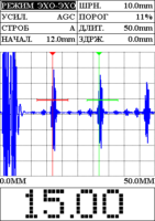 Помимо определения толщины изделия, прибор можно использовать в качестве ультразвукового дефектоскопа, так как на А- развертке возможно отображение сигналов от внутренних дефектов. А функция В-скана позволяет визуализировать профиль контролируемого изделия при сканировании датчиком по поверхности.
