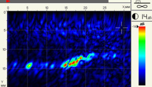 • Сканирование вдоль линии сварного шва антенной решеткой с установленным на ней датчиком пути (поставляется опционально) позволяет в режиме реального времени получать наглядное и достоверное представление о внутренней структуре объекта контроля в виде С- и D- Сканов.