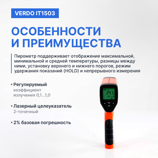 Пирометры инфракрасные Verdo IT1503 предназначен для бесконтактного измерения температуры поверхностей твёрдых тел, газовых струй и расплавов различных материалов. Работает на основе преобразования потока инфракрасного излучения исследуемого объекта через оптическую систему и инфракрасный фильтр на фотоэлектрический приёмник. Затем сигнал преобразуется внутренней микропроцессорной системой в цифровой сигнал. Пирометр изготовлен в пластиковом корпусе с инфракрасным датчиком, лазерным целеуказателем и кнопкой для измерения температуры и включения пирометра. На лицевой стороне расположены жидкокристаллический дисплей и кнопки управления. Микропроцессорная система пирометров обеспечивает обработку результатов измерений и индикацию текущего значения температуры объекта на дисплее.